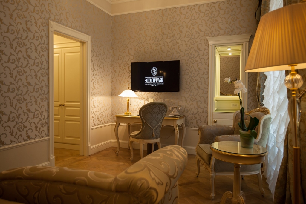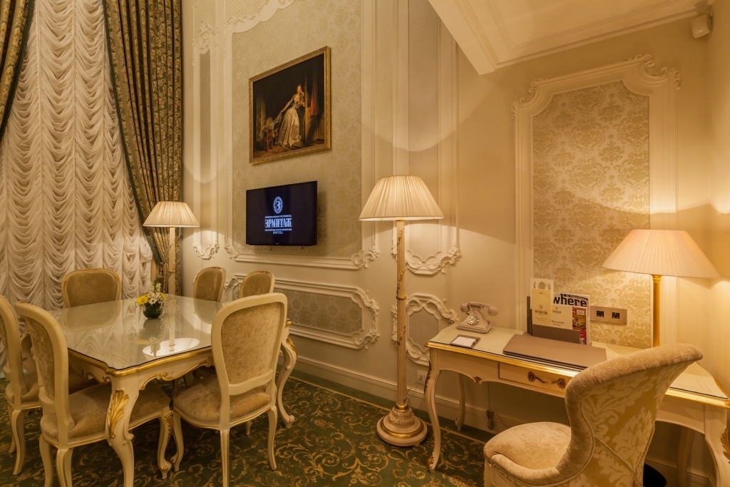 Роскошный двухэтажный номер с гостиной,двумя спальнями и гардеробной комнатой. В него входит: императорские двуспальные кровати кингсайз, жк телевизор, кондиционер, телефон, сейф, приватный бар, большой рабочий стол, эксклюзивная мебель, гибкие светодиодные лампы, прикроватные тумбы, пуховые одеяла и подушки, гладильная доска с утюгом, бутилированная вода, набор для приготовления кофе с кофе-машиной, главная ванная комната и гостевая ванная, халат и тапочки, фен, ванные и гигиенические принадлежности, высокоскоростной интернет.